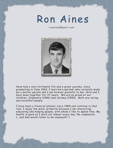 g r a d u a t in g in J u n e 1 9 6 9 . I m a r r ie d a p a r t n e r w h o c e r t a in ly m a d e meabetterpersonandIam forevergratefultoher.NitaandI have been together for 37 years. W e are so proud of our children,Stephanie(1986)andJeremy(1990). Botharecaring and excelentpeople.