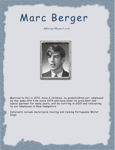 Married to Pat in 1972, have 2 children, no gradchildren yet, employed by the same CPA firm since 1974 and have been its president and senior partner for many years, will be retiring in 2019 and relocating to our lakehouse in New Hampshire.