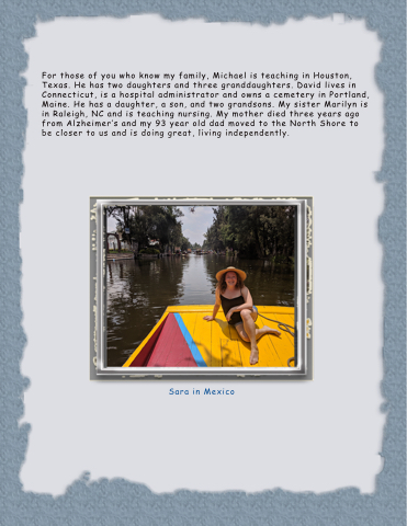 For those of you who know my family, Michael is teaching in Houston, Texas. He has two daughters and three granddaughters. David lives in Connecticut, is a hospital administrator and owns a cemetery in Portland, Maine. He has a daughter, a son, and two grandsons. My sister Marilyn is in Raleigh, NC and is teaching nursing. My mother died three years ago from Alzheimer's and my 93 year old dad moved to the North Shore to be closer to us and is doing great, living independently.