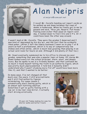 I recall Mr. Coviello handing out report cards as he walked up and down between the rows of desks in homeroom. When he finally got to me he paused and said, "Nice job, Neipris. Full house." Feeling even sicker than usual on report card day, I looked down to find 3 D's and 2 F's. Or it could have been the other way around.
