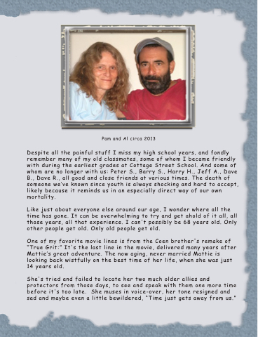 Despite all the painful stuff I miss my high school years, and fondly remember many of my old classmates, some of whom I became friendly with during the earliest grades at Cottage Street School. And some of whom are no longer with us: Peter 5., Barry 5., Harry H., Jeff A., Dave B., Dave R., all good and close friends at various times. The death of someone we've known since youth is always shocking and hard to accept, likely because it reminds us in an especially direct way of our own mortality.