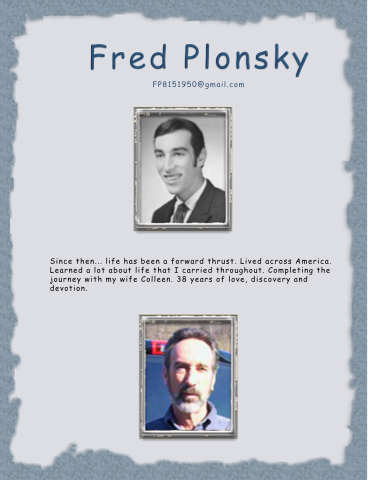 Fred Plonsky FP8151950@gmail.com Since then... life has been a forward thrust. Lived across America. Learned a lot about life that I carried throughout. Completing the journey with my wife Colleen. 38 years of love, discovery and devotion