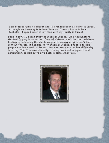 Back in 1977, I began studying Medical Qigong. Like Acupuncture, Medical Qigong is an ancient f orm of Chinese Medicine that achieves healing by balancing the electr•°magnetic energy or qi in one's body without the use of needles. W ith Medical Qigong, I'm able to help people who have medical issue! that western medicine has difficulty treating. This I do avocational ly- f o r my personal enjoyment and enrichment, as well as to give back in some, small way.