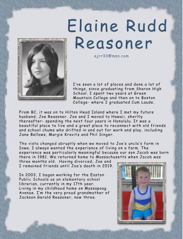 Living in my childhood home on Massapoag Avenue. I'm the very proud grandmother of Jackson Gerald Reasoner, now three.