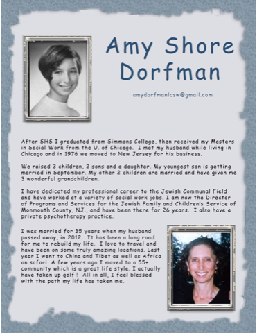 After SHS I graduated from Simmons College, then received my Masters in Social Work from the U. of Chicago. I met my husband while living in Chicago and in 1976 we moved to New Jersey for his business.