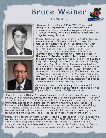 It was during my Senior year at SHS that I decided I wanted to attend Pharmacy school. I recall Mr. Marcus, our Biology teacher, suggesting that I not pursue the Science track. Nonetheless, with the assistance of Mr. Soule, I applied to, and was accepted at both the Massachusetts College of Pharmacy and Northeastern University's College of Pharmacy. I decided to attend Northeastern and had the opportunity to work during college at the Goddard Hospital in Stoughton as well as the Cardinal Cushing Hospital in Brockton. A f t e r I received my Bachelor