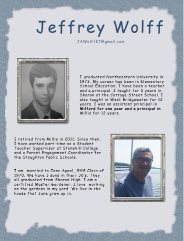 I retired from Millis in 2011. Since then, I have worked part-time as a Student Teacher Supervisor at Stonehill College and a Parent Engagement Coordinator for the Stoughton Public Schools.