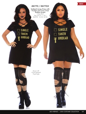 86770 / 86770X Undead Jersey Dress with Pockets and Cross Over Bodice Accent Color: Black Size: 86770 - S, M, L 86670X - 1X/2X, 3X/4X Shown with: 6328 Distressed Thigh Highs LEG AVENUE | 2018 COSTUME COLLECTION 107