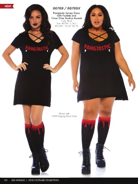 86769 / 86769X Fangtastic Jersey Dress with Pockets and Cross Over Bodice Accent Color: Black Size: 86769 - S, M, L 86769X - 1X/2X, 3X/4X Shown with: 6909 Dripping Blood Socks 110 LEG AVENUE | 2018 COSTUME COLLECTION