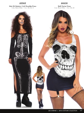 85565 86636 Side Slit Skeleton Cold Shoulder Dress Skull Garter Dress Color: Black/White | Size: SM, ML, XL Color: Black/White | Size: SM, ML LEG AVENUE | 2018 COSTUME COLLECTION 117