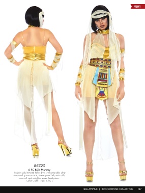 86723 6 PC Nile Mummy Includes gold trimmed halter dress with removable clear straps and gauze accents, ornate panel belt, wrist cuffs, arm cuff, and matching gauze head piece. Color: Gold | Size: S, M, L LEG AVENUE | 2018 COSTUME COLLECTION 127