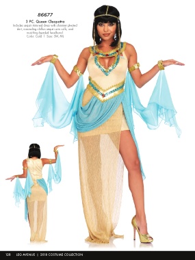 86677 3 PC. Queen Cleopatra Includes sequin trimmed dress with shimmer pleated skirt, cascading chiffon sequin arm cuffs, and matching beaded headband. Color: Gold | Size: SM, ML 128 LEG AVENUE | 2018 COSTUME COLLECTION