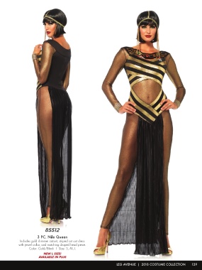85512 3 PC. Nile Queen Includes gold shimmer catsuit, striped cut out dress with jewel collar, and matching draped head piece. Color: Gold/Black | Size: S, M, L NEW L SIZE! AVAILABLE IN PLUS LEG AVENUE | 2018 COSTUME COLLECTION 129