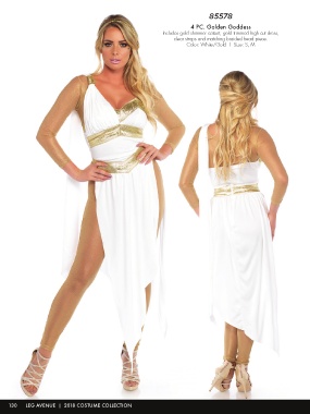 85578 4 PC. Golden Goddess Includes gold shimmer catsuit, gold trimmed high cut dress, clear straps and matching braided head piece. Color: White/Gold | Size: S, M 130 LEG AVENUE | 2018 COSTUME COLLECTION