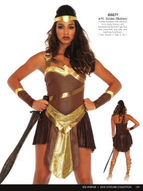 86671 4 PC. Golden Gladiator Includes bodysuit with attached cross body harness and asymmetrical shimmer high/low skirt, panel belt, arm cuffs, and matching headband. Color: Brown | Size: S, M, L LEG AVENUE | 2018 COSTUME COLLECTION 135