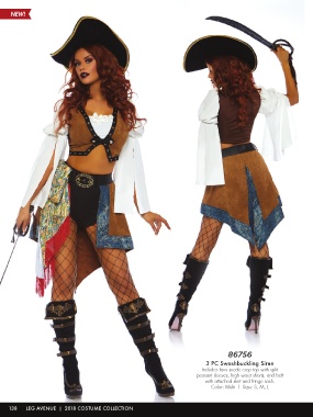 86756 3 PC Swashbuckling Siren Includes faux suede crop top with split peasant sleeves, high waist shorts, and belt with attached skirt and fringe sash. Color: Multi | Size: S, M, L 138 LEG AVENUE | 2018 COSTUME COLLECTION