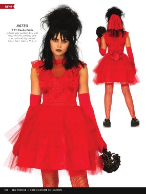 86730 2 PC Beetle Bride Includes satin and lace dress with tiered tulle skirt, attached back bow, and matching lace veil. Color: Red | Size: S, M, L, XL 186 LEG AVENUE | 2018 COSTUME COLLECTION