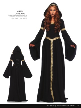 85531 Pagan Witch Features long hooded cloak with embroidered celtic braid trim and corset lace up back. Color: Black | Size: SM, ML, XL LEG AVENUE | 2018 COSTUME COLLECTION 193