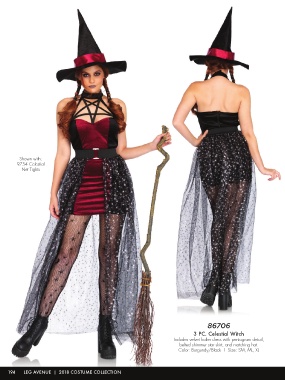 Shown with: 9754 Celestial Net Tights 86706 3 PC. Celestial Witch Includes velvet halter dress with pentagram detail, belted shimmer star skirt, and matching hat. Color: Burgundy/Black | Size: SM, ML, XL 194 LEG AVENUE | 2018 COSTUME COLLECTION
