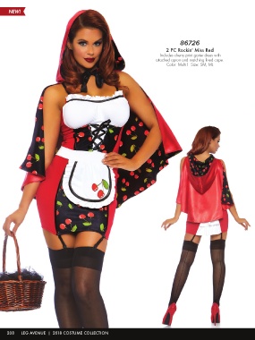 86726 2 PC Rockin' Miss Red Includes cherry print garter dress with attached apron and matching lined cape. Color: Multi | Size: SM, ML 208 LEG AVENUE | 2018 COSTUME COLLECTION
