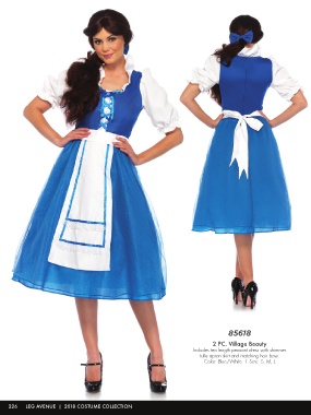 85618 2 PC. Village Beauty Includes tea length peasant dress with shimmer tulle apron skirt and matching hair bow. Color: Blue/White | Size: S, M, L 226 LEG AVENUE | 2018 COSTUME COLLECTION