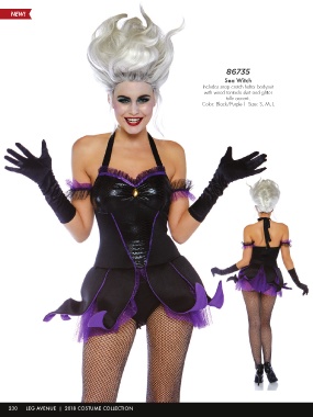 NEW! 86735 Sea Witch Includes snap crotch halter bodysuit with wired tentacle skirt and glitter tulle accent. Color: Black/Purple | Size: S, M, L 230 LEG AVENUE | 2018 COSTUME COLLECTION