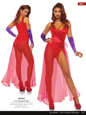86784 3 PC Bombshell Babe Includes satin bodysuit with clear straps, attached high slit glitter shimmer skirt, and matching arm pieces. Color: Red | Size: S, M, L LEG AVENUE | 2018 COSTUME COLLECTION 245
