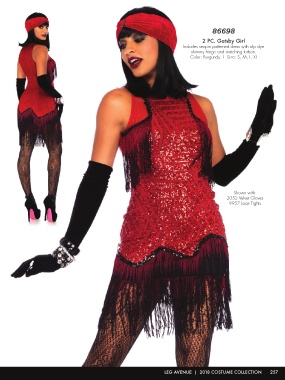86698 2 PC. Gatsby Girl Includes sequin patterned dress with dip dye shimmy fringe and matching turban. Color: Burgundy | Size: S, M, L, XL Shown with: 2052 Velvet Gloves 9957 Lace Tights LEG AVENUE | 2018 COSTUME COLLECTION 257