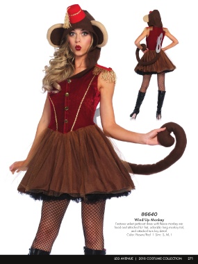 85611 86640 Wind Up Monkey Features velvet petticoat dress with fleece monkey ear hood and attached fez hat, adorable long monkey tail, and attached turn key detail. Color: Brown/Red | Size: S, M, L LEG AVENUE | 2018 COSTUME COLLECTION 271