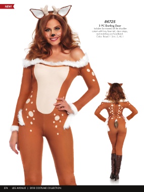 86725 3 PC Darling Deer Includes fur trimmed off the shoulder catsuit with furry fawn tail, clear straps, and matching ear headband. Color: Brown | Size: S, M, L 274 LEG AVENUE | 2018 COSTUME COLLECTION
