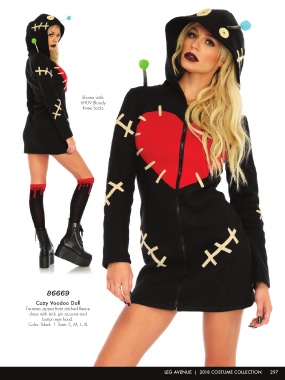 Shown with: 6909 Bloody Knee Socks 86669 Cozy Voodoo Doll Features zipper front stitched fleece dress with stick pin accents and button eye hood. Color: Black | Size: S, M, L, XL LEG AVENUE | 2018 COSTUME COLLECTION 297