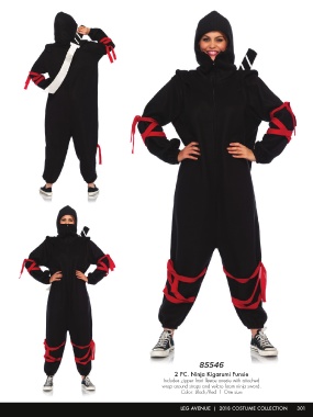 85546 2 PC. Ninja Kigarumi Funsie Includes zipper front fleece onesie with attached wrap around straps and velcro foam ninja sword. Color: Black/Red | One size LEG AVENUE | 2018 COSTUME COLLECTION 301
