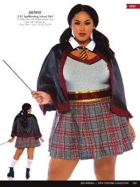 86761X 2 PC Spellbinding School Girl Includes dress with badge accents and cape with attached tie. Color: Multi | Size: 1X/2X, 3X/4X LEG AVENUE | 2018 COSTUME COLLECTION 329