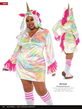 86724X Enchanted Unicorn Features velvet zipper front dress with tail and magical gold horn hood. Color: Multi | Size: 1X/2X, 3X/4X 344 LEG AVENUE | 2018 COSTUME COLLECTION