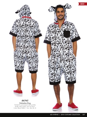 86743 Dalmatian Dog Features fur print jumpsuit with pockets, double sided zipper, and ear hood. Color: Black/White | Size: SM, ML, XL LEG AVENUE | 2018 COSTUME COLLECTION 357
