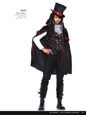 85270 3 PC. Classic Vampire Includes velvet brocade vest, neck piece, and long cape. Color: Black | Size: M, L, XL LEG AVENUE | 2018 COSTUME COLLECTION 367