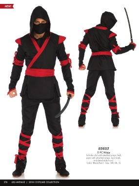 85653 5 PC Ninja Includes shirt with attached wraps, belt, pants with attached wraps, face mask, and detachable hood. Color: Black/Red | Size: SM, ML, XL 376 LEG AVENUE | 2018 COSTUME COLLECTION