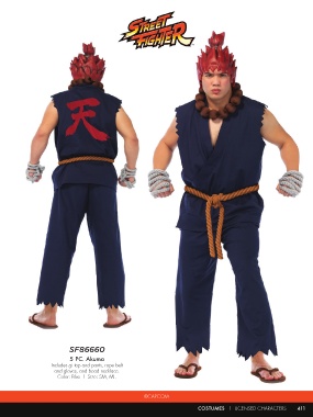 SF86660 Akuma latex molded wig. 5 PC. Akuma Color: Red. One Size Includes gi top and pants, rope belt and gloves, and bead necklace. Color: Blue | Size: SM, ML. ©CAPCOM COSTUMES | LICENSED CHARACTERS 411