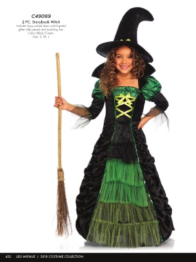 C49089 2 PC. Storybook Witch Includes long ruched dress with layered glitter tulle panels and matching hat. Color: Black/Green. Size: S, M, L. 422 LEG AVENUE | 2018 COSTUME COLLECTION