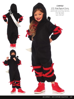 C49102 2 PC. Ninja Kigarumi Funsie Includes zipper front fleece onesie with attached wrap around straps and velcro foam ninja sword. Color: Black/Red. Size: S/M, M/L. LEG AVENUE | 2018 COSTUME COLLECTION 423