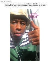 Film, TV, & Celebrity Musician Tyler, the Creator wears the LACOTE L.12.12 85th Anniversary Limited Edition Pique Polo (Style # PH7327-51) on his Instagram Story