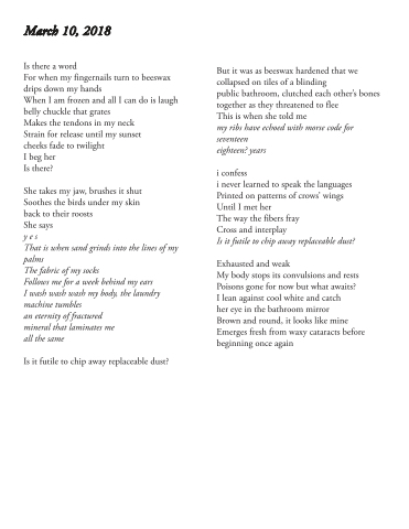 She takes my jaw, brushes it shut Soothes the birds under my skin back to their roosts