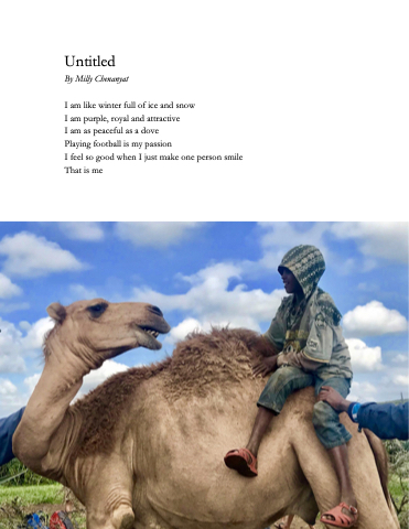 Untitled By Milly Chenanyat I am like winter full of ice and snow I am purple, royal and attractive I am as peaceful as a dove Playing football is my passion I feel so good when I just make one person smile That is me 16