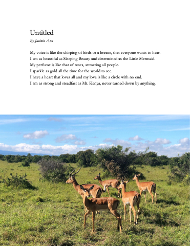 My voice is like the chirping of birds or a breeze, that everyone wants to hear. I am as beautiful as Sleeping Beauty and determined as the Little Mermaid. My perfume is like that of roses, attracting all people.