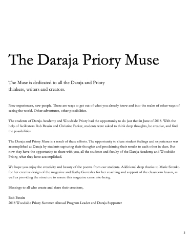 The Daraja and Priory Muse is a result of these efforts. The opportunity to share student feelings and experiences was accomplished at Daraja by students capturing their thoughts and proclaiming their results to each other in class. But now they have the opportunity to share with you, all the students and faculty of the Daraja Academy and Woodside Priory, what they have accomplished.