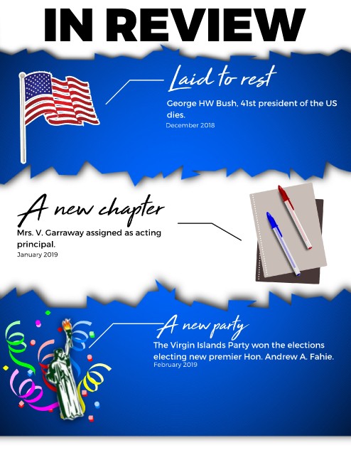 IN REVIEW George HW Bush, 41st president of the US dies. December 2018 Mrs. V. Garraway assigned as acting principal. January 2019 The Virgin Islands Party won the elections electing new premier Hon. Andrew A. Fahie. February 2019