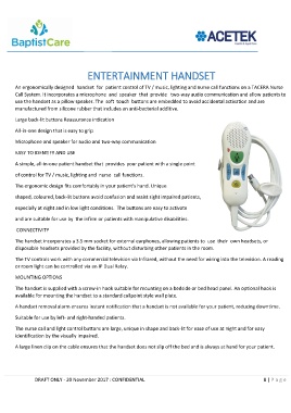 An ergonomically designed handset for patient control of TV / music, lighting and nurse call functions on a TACERA Nurse
