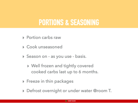 PORTIONS & SEASONING ▸ ▸ ▸ ▸ ▸ ▸ Portion carbs raw Cook unseasoned Season on - as you use - basis. Well frozen and tightly covered cooked carbs last up to 6 months. Freeze in thin packages Defrost overnight or under water @room T. Patricia McCausland-Gallo, CCP YouTube Pachigallo