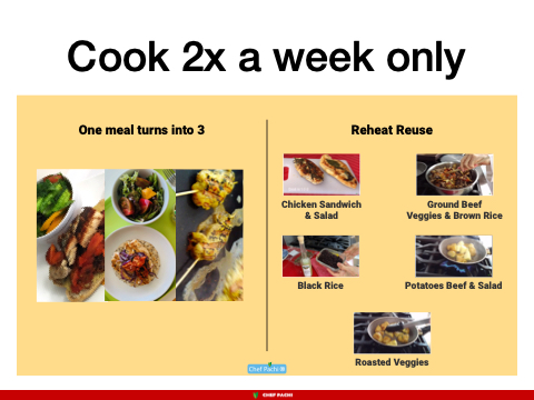 Cook 2x a week only One meal turns into 3 Reheat Reuse Chicken Sandwich & Salad Black Rice Ground Beef Veggies & Brown Rice Potatoes Beef & Salad Roasted Veggies