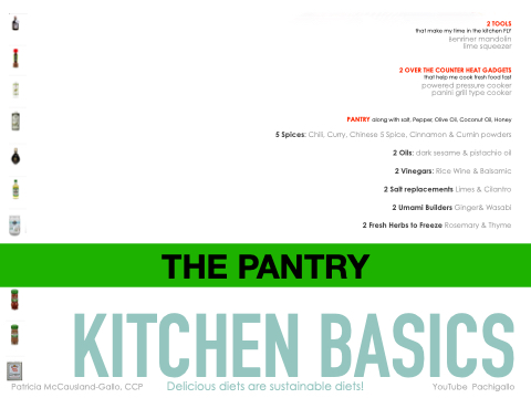 The kit hacki F streamlined to ease and enjoy a healthy lifestyle that make my time in the Benriner lime s 2 OVER THE COUNTER HEAT that help me cook fre powered pressur panini grill typ PANTRY along with salt, Pepper, Olive Oil, Coconu 5 Spices: Chili, Curry, Chinese 5 Spice, Cinnamon & Cumin 2 Oils: dark sesame & pist tasty chen g kit. Time & 2 TOOLS that make my time in the kitchen FLY Benriner mandolin lime squeezer 2 OVER THE COUNTER HEAT GADGETS that help me cook fresh food fast powered pressure cooker panini grill type cooker lavor Pachi in less time. 2 TOOLS kitchen FLY andolin queezer GADGETS sh food fast cooker cooker t Oil, Honey powders achio oil 2 Oils: dark sesame & pistachio oil 2 Vinegars: Rice Wine & Balsamic 2 Salt replacements Limes & Cilantro 2 Umami Builders Ginger& Wasabi 2 Fresh Herbs to Freeze Rosemary & Thyme PANTRY along with salt, Pepper, Olive Oil, Coconut Oil, Honey 5 Spices: Chili, Curry, Chinese 5 Spice, Cinnamon & Cumin powders THE PANTRY PACHI ‘S a three year retirement, she’s back teaching the world how to cook delicious and 2 Vinegars: Rice Wine & Balsamic Experienced, licensed and published in both sweet and savory cooking. Pachi has been 2 Salt replacements Limes & Cilanatrwo arded in France and the U.S. by Gourmand and IPPY and has worked in professional kitchens since 1975 (studied 1978-83) and went back to the food business until 2010. After 2 Umami Builders Ginger& Wasabi healthy food everyday. Has been a public speaker at Starbucks Headquarters in Seattle, Food Conferences in New York, New Orleans, and Latin America. Now developing 2 Fresh Herbs to Freeze Rosemary & Thyme recipes and speaking for Dr Clyde Wilson at Stanford and an online platform. Pachi ...your life KITCHEN BASICS Experienced, licensed and published in both sweet and savory cooking. Pachi has been awarded in France and the U.S. by Gourmand and IPPY and has worked in professional ...your life to so you can cook & loose weight. kitchens since 1975 (studied 1978-83) and went back to the food business until 2010. After a three year retirement, she’s back teaching the world how to cook delicious and healthy food everyday. Has been a public speaker at Starbucks Headquarters in Seattle, Food Conferences in New York, New Orleans, and Latin America. Now developing recipes and speaking for Dr Clyde Wilson at Stanford and an online platform. to so you can Pachi cook & loose weight. Patricia McCausland-Gallo, CCP Delicious diets are sustainable diets! YouTube Pachigallo n m e e